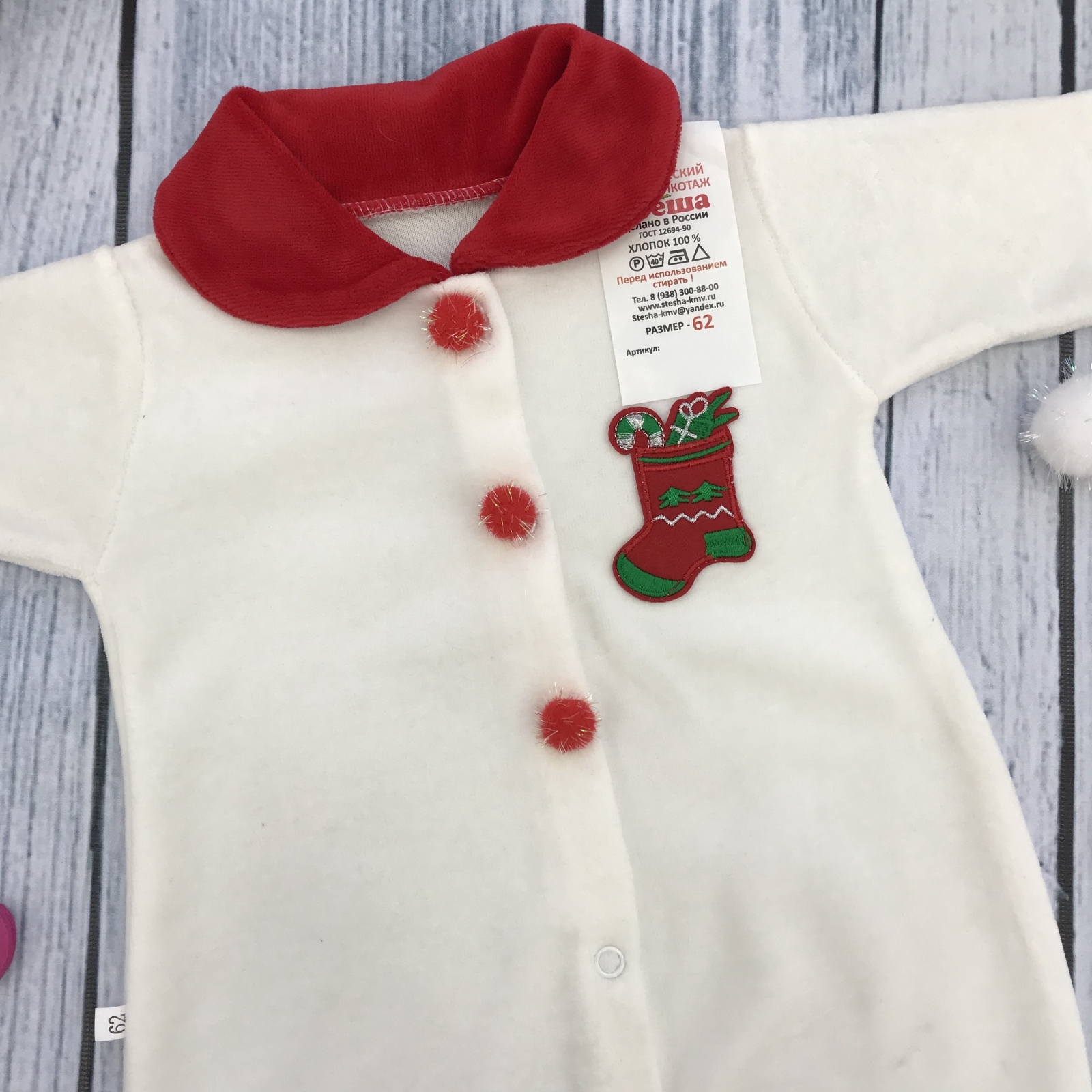 Теги: Купить оптом новогодний комбинезон от производителя. 244. Комбинезон Санта, хлопок 80% велюр 20% ПЭ, молочный 56,62,68 цена,отзывы официальный сайт "Стеша Пенза"