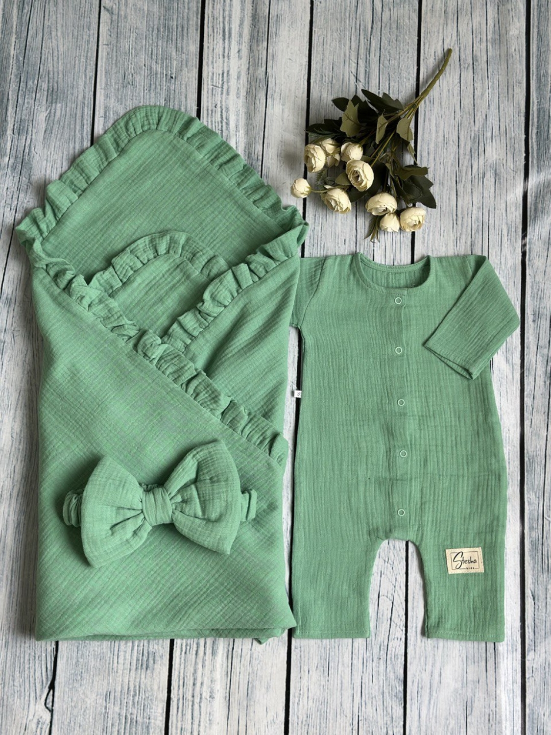 Теги: Купить детские конверты, комбинезон оптом, детские конверты на выписку оптом. 335-ОЛ. Комплект из детского комбинезона, р 56 и конверта муслин, хлопок 100% 90/90 см, олива цена,отзывы официальный сайт "Стеша Пенза"
