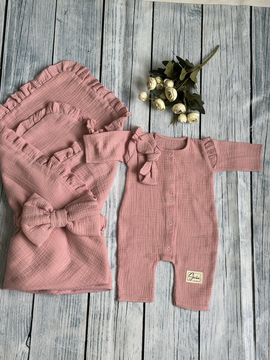 Теги: Купить детские конверты, комбинезон оптом, детские конверты на выписку оптом. 335-П. Комплект из детского комбинезона, р 56 и конверта муслин, хлопок 100% 90/90 см, пудра цена,отзывы официальный сайт "Стеша Пенза"